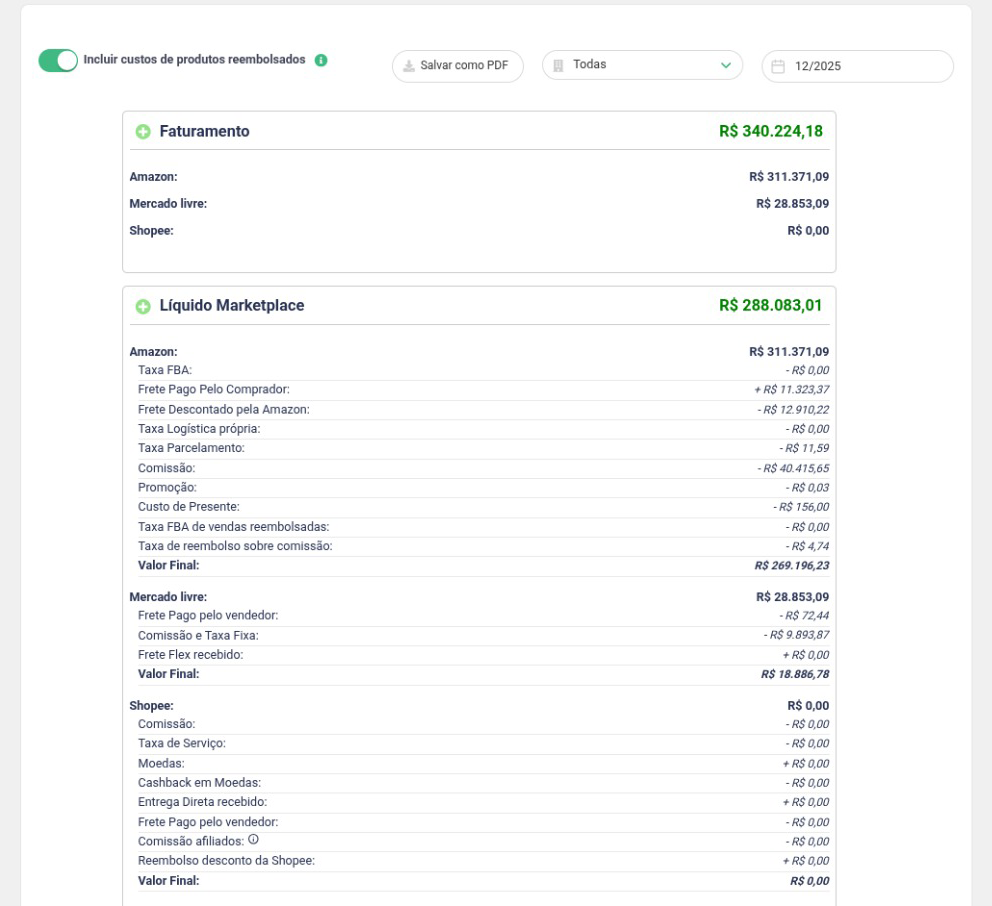 A seção de Resumo Financeiro do Gestor Seller fornece uma visão clara e detalhada da saúde financeira do seu negócio. Nela, você pode acompanhar o faturamento total, custos operacionais, impostos, comissões dos marketplaces e lucro líquido. Além disso, o sistema permite visualizar métricas essenciais como margem de lucro e despesas com frete, facilitando a análise de rentabilidade e tomada de decisões estratégicas para otimizar seus resultados.