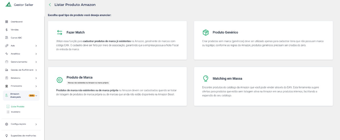Cadastro de Produtos: Permite criar novos produtos diretamente no Gestor Seller, definindo atributos como nome, descrição, preço, estoque e imagens.