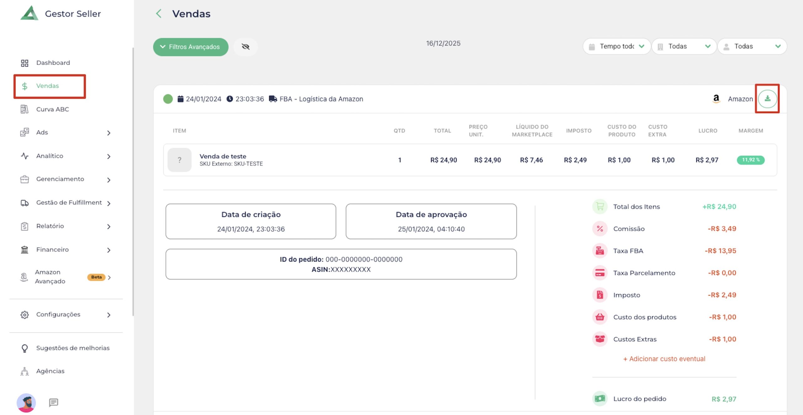 Consulte informações detalhadas do pedido, como produtos, valores, taxas e dados da operação FBA.
