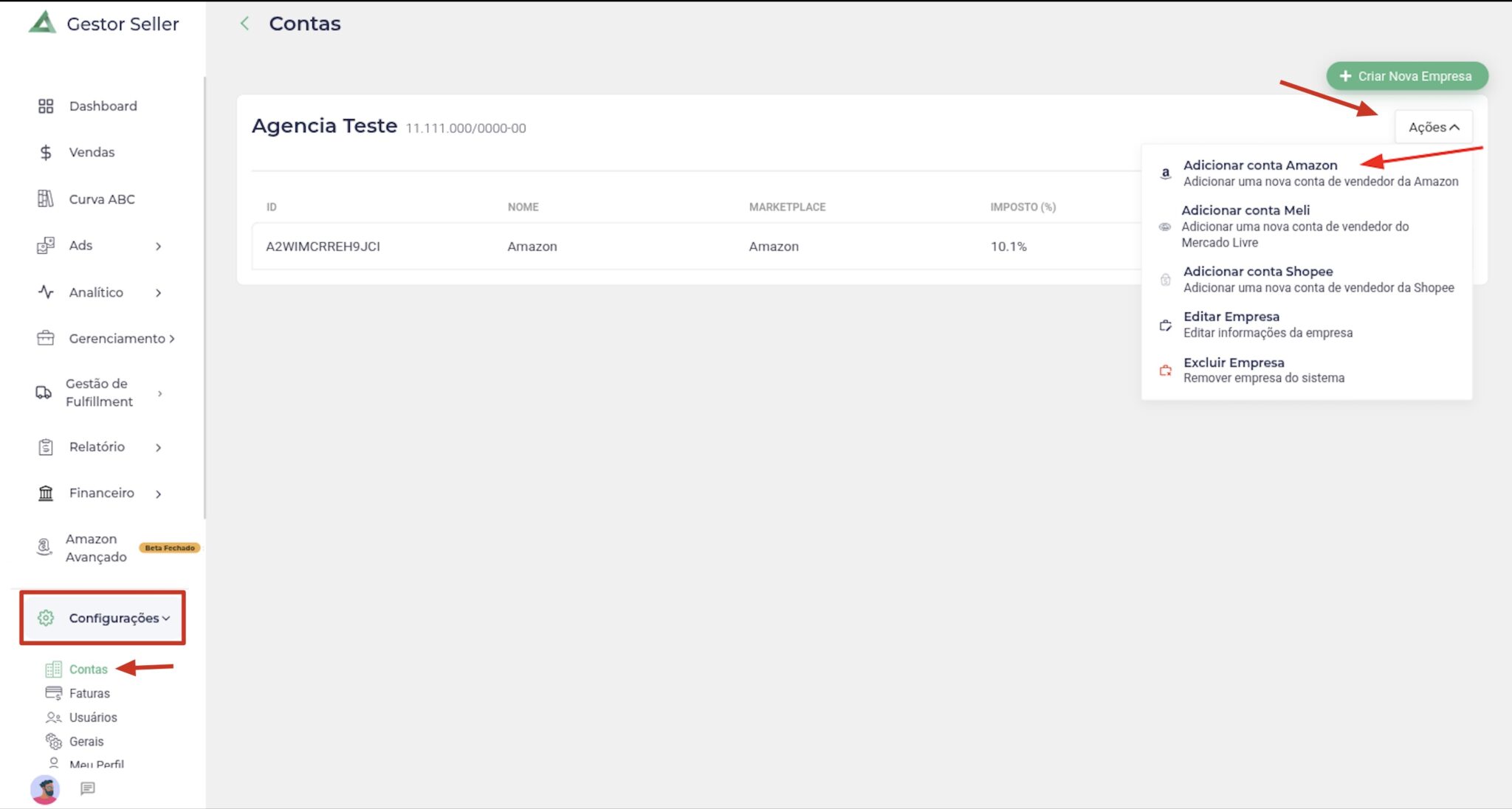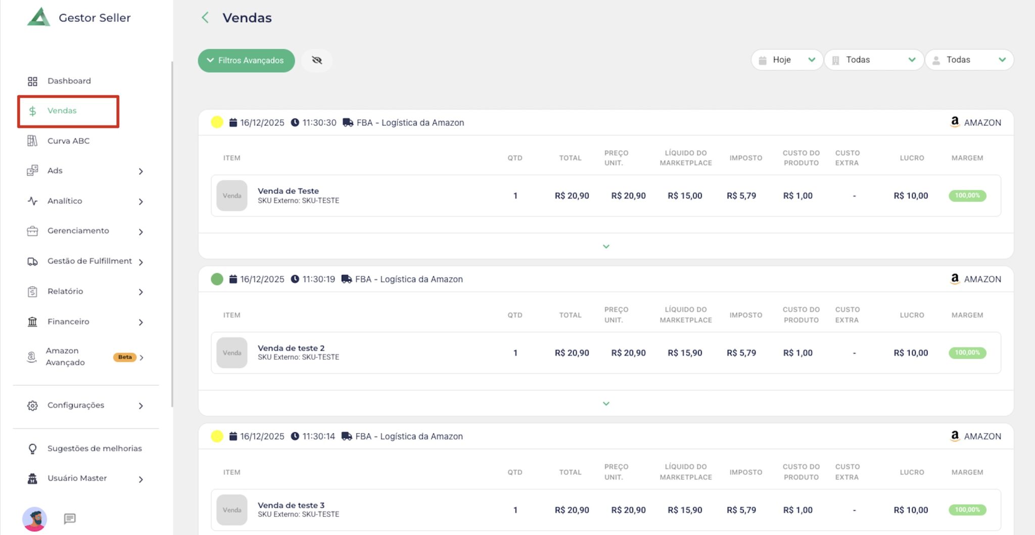 Vincule sua conta da Amazon ao Gestor Seller para ativar a integração FBA. Os pedidos enviados pela Amazon serão sincronizados automaticamente no sistema.