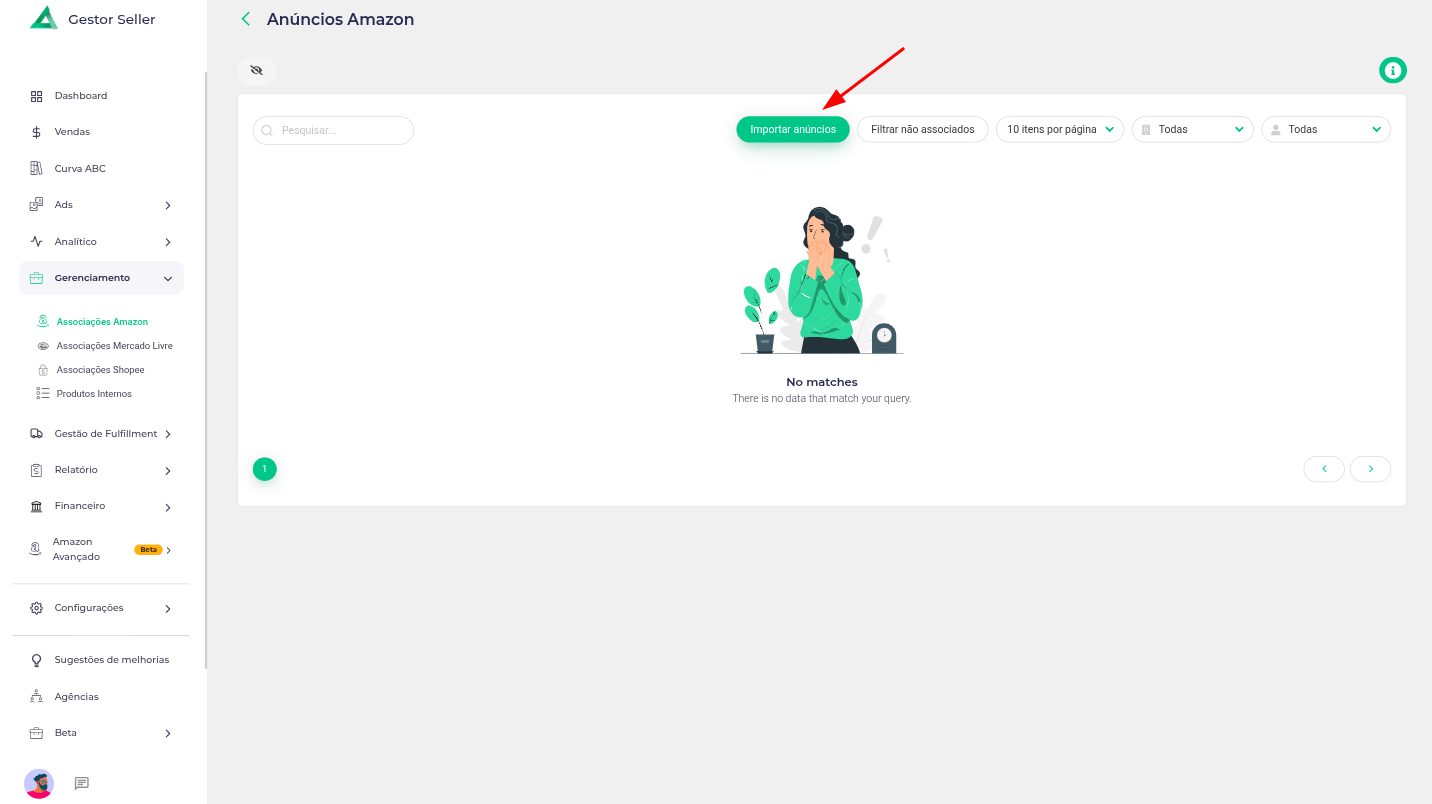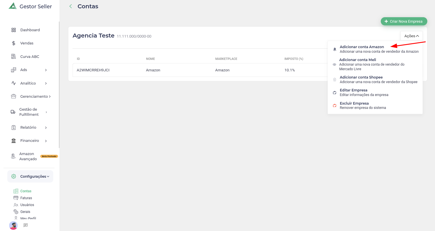 Navegue até Configurações > Contas no menu lateral. Você deverá criar uma empresa, clicando em Criar Nova Empresa, após isso, clique em Ações > Adicionar conta Amazon e siga as instruções para autorizar o acesso de forma rápida e segura. É o primeiro passo para começar a vender na maior plataforma do mundo.